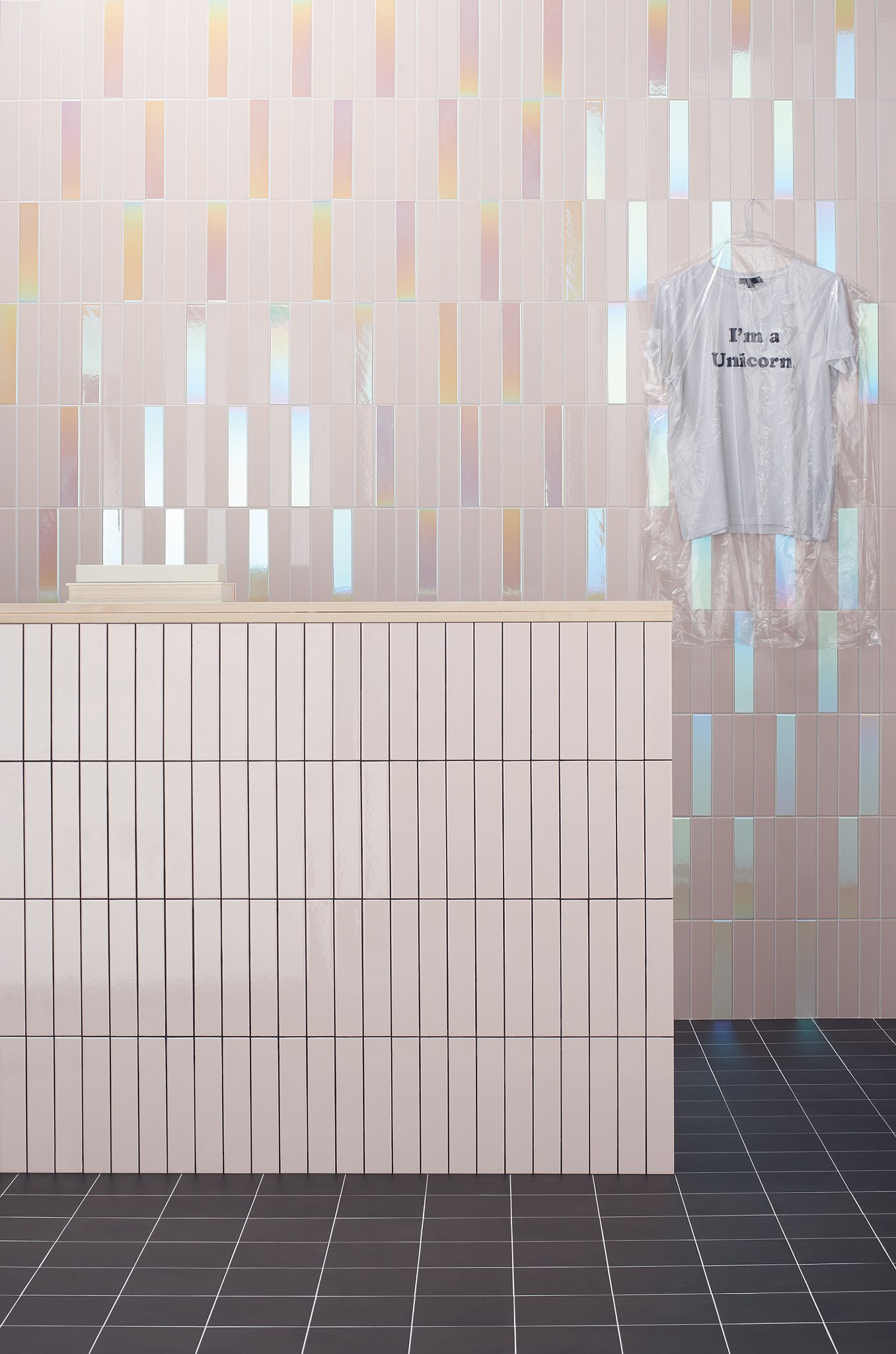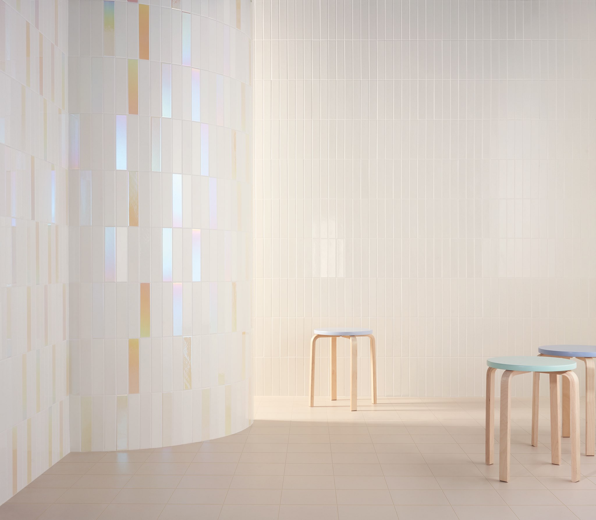 Spectre is a ceramic wall collection, available in 4 colours, Milk, Cream, Sky and Rose, each having a matt or gloss surface, with the option of a mix of matt, gloss and a holographic finish, which creates an iridescent look on the surface.