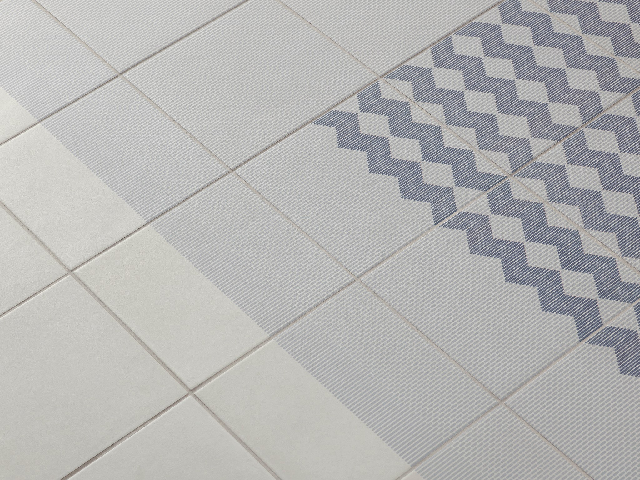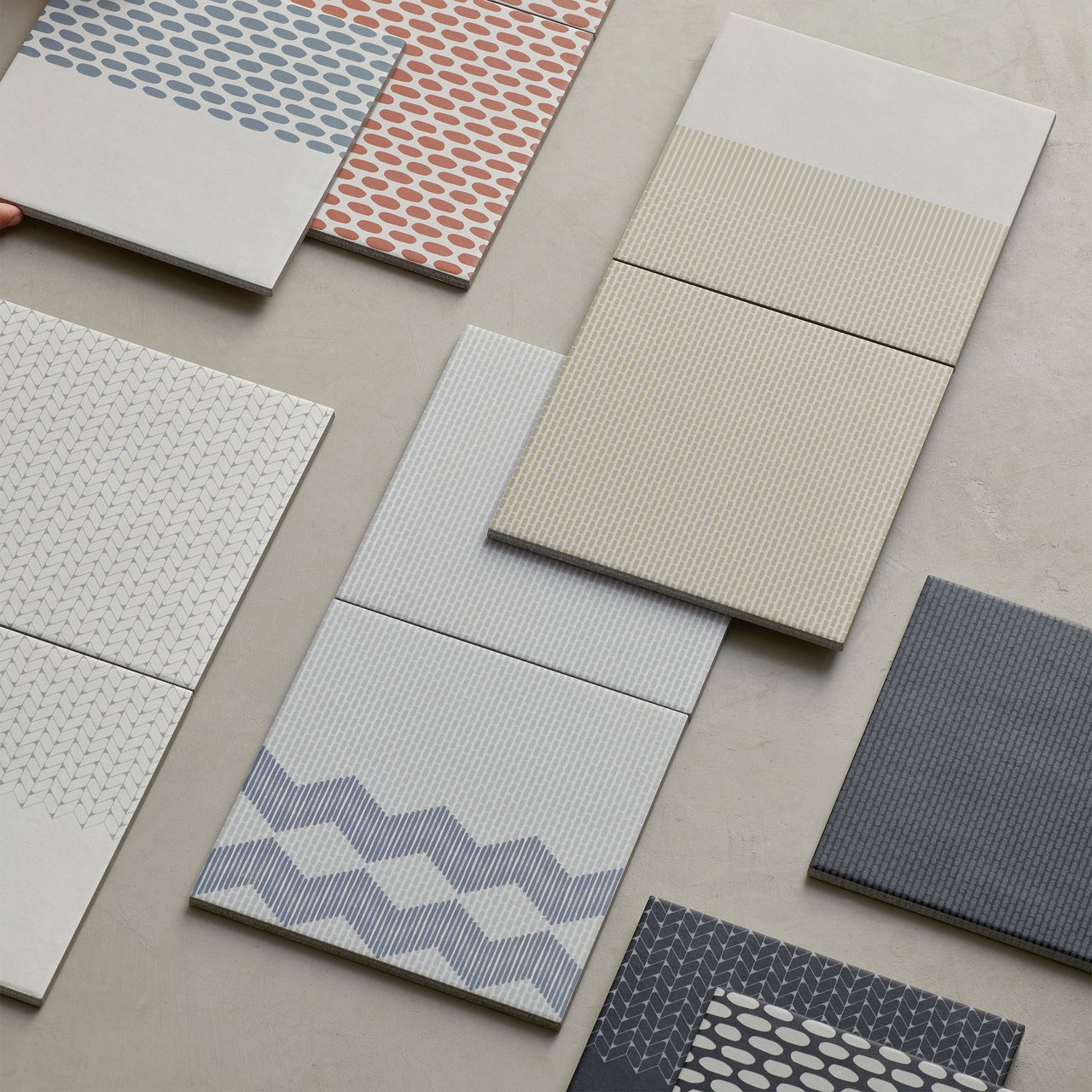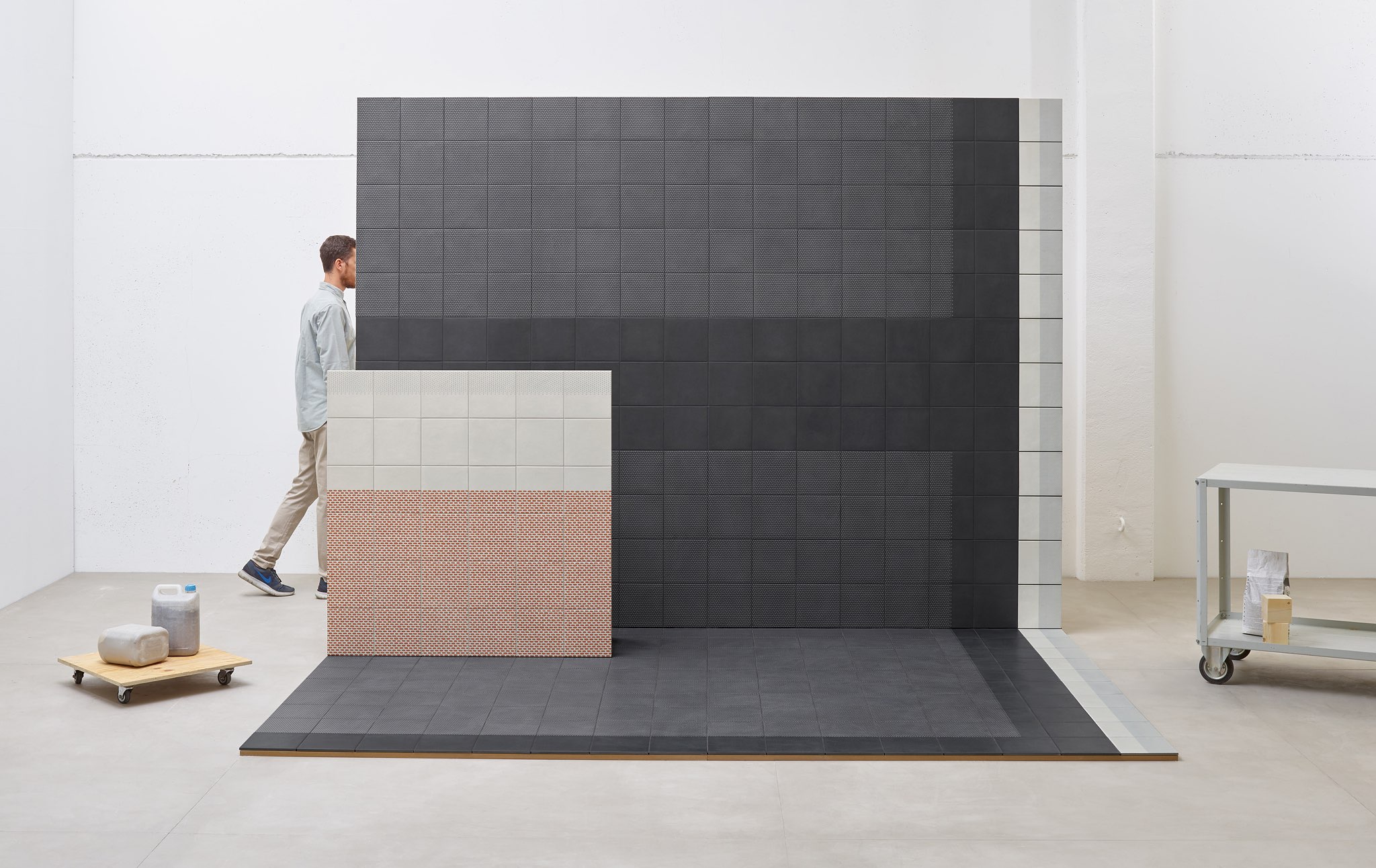 Tape is made up of several coloured patterns on two base tiles, one white and one black, creating different atmospheres in the same room and a soft blend of one pattern with the other. Designed by Raw Edges