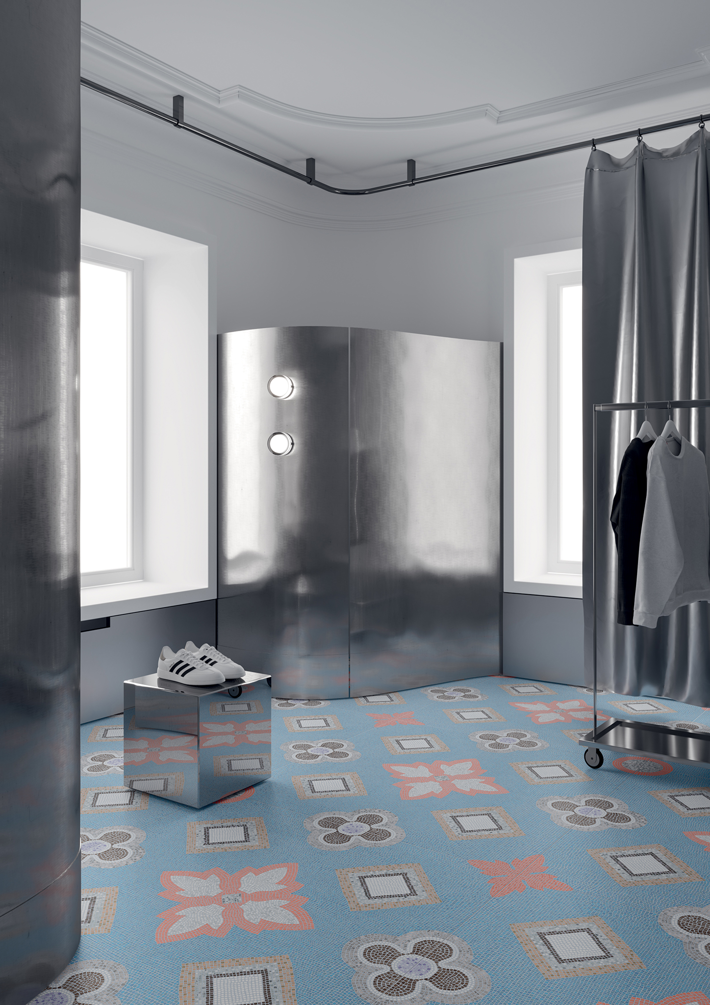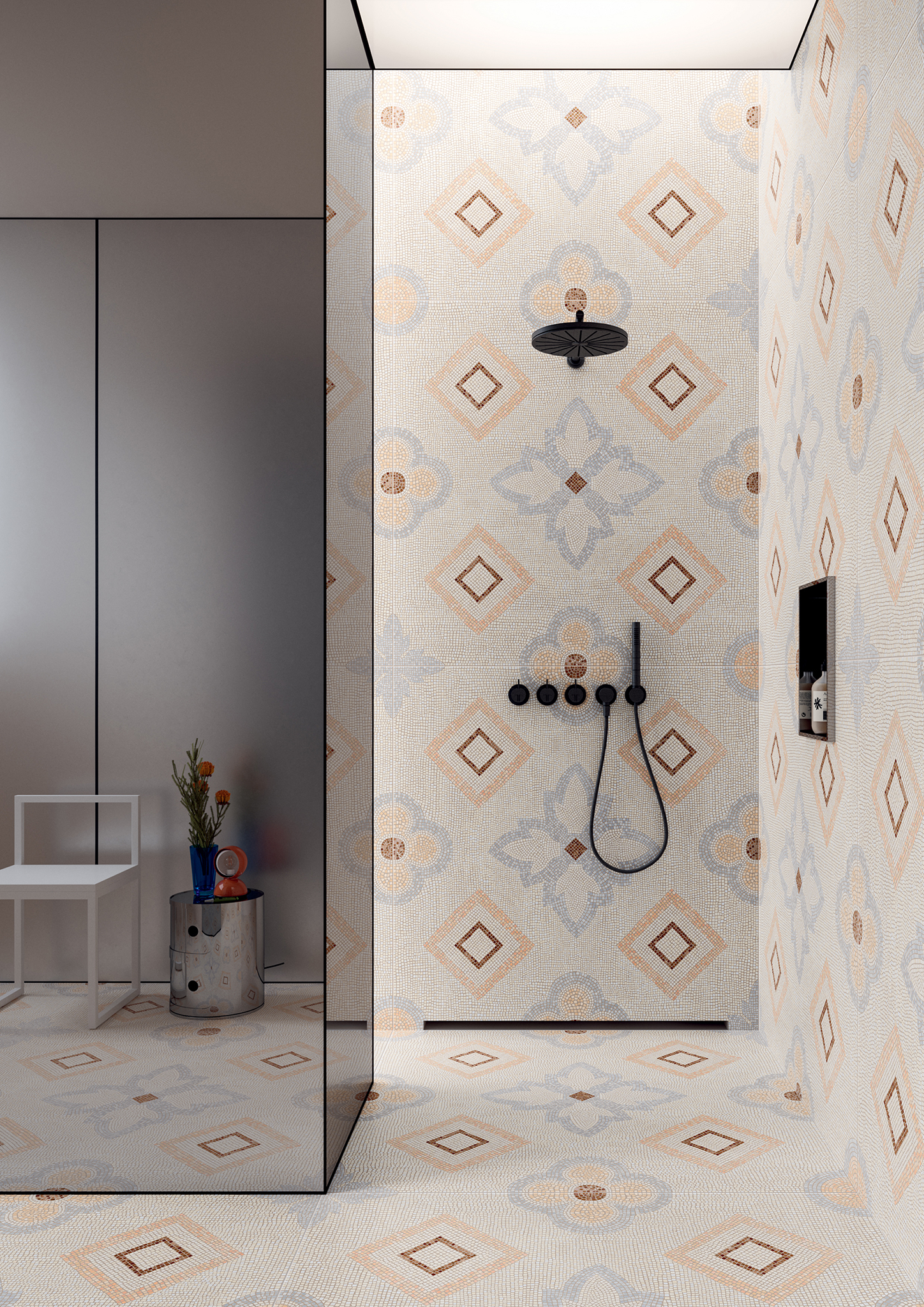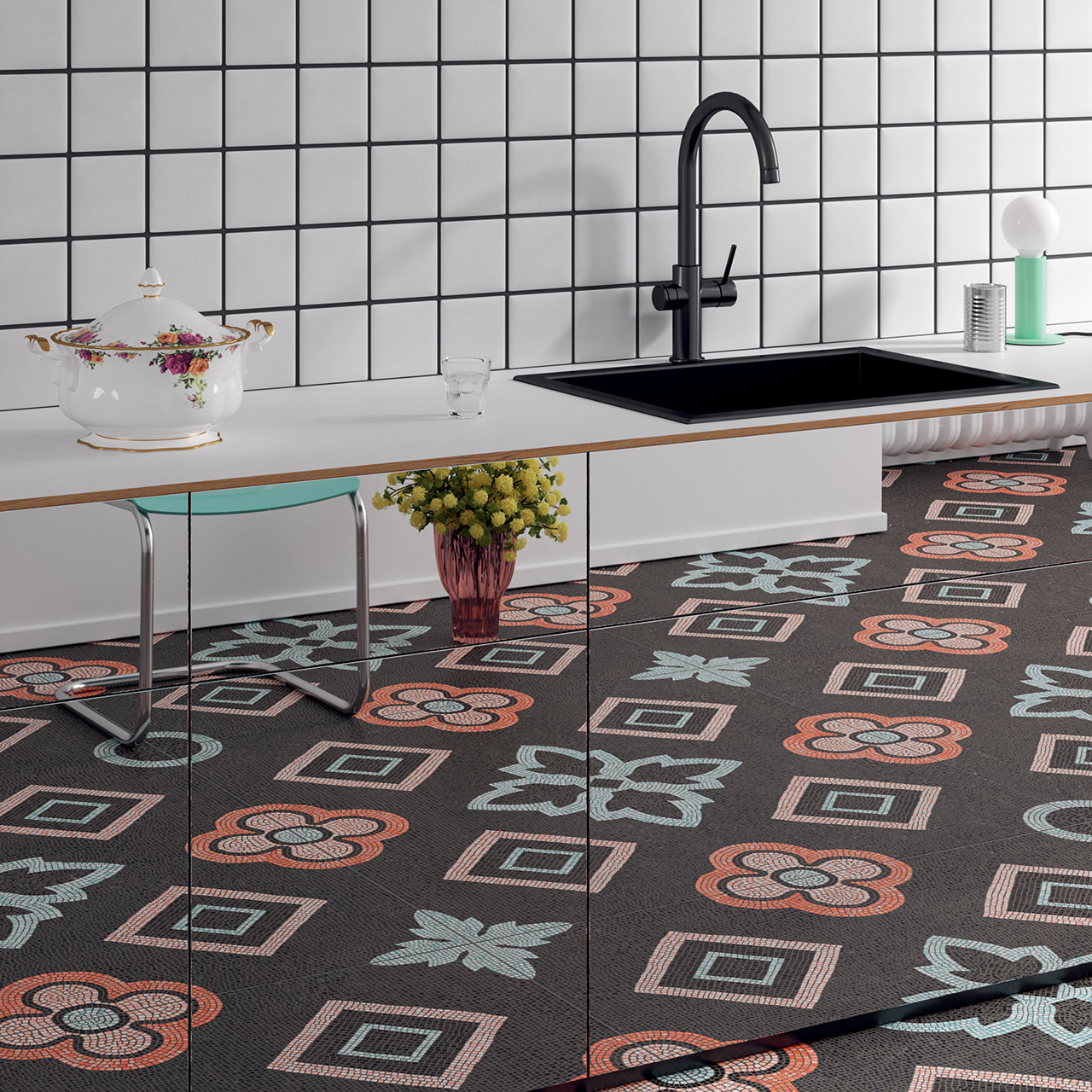 The traditional Roman mosaic has been reinterpreted into a flamboyant tone, and is available in a maxi size 1200×1200. TWO is the latest collection of large format decoration, belonging to the same family as the ONE collection
