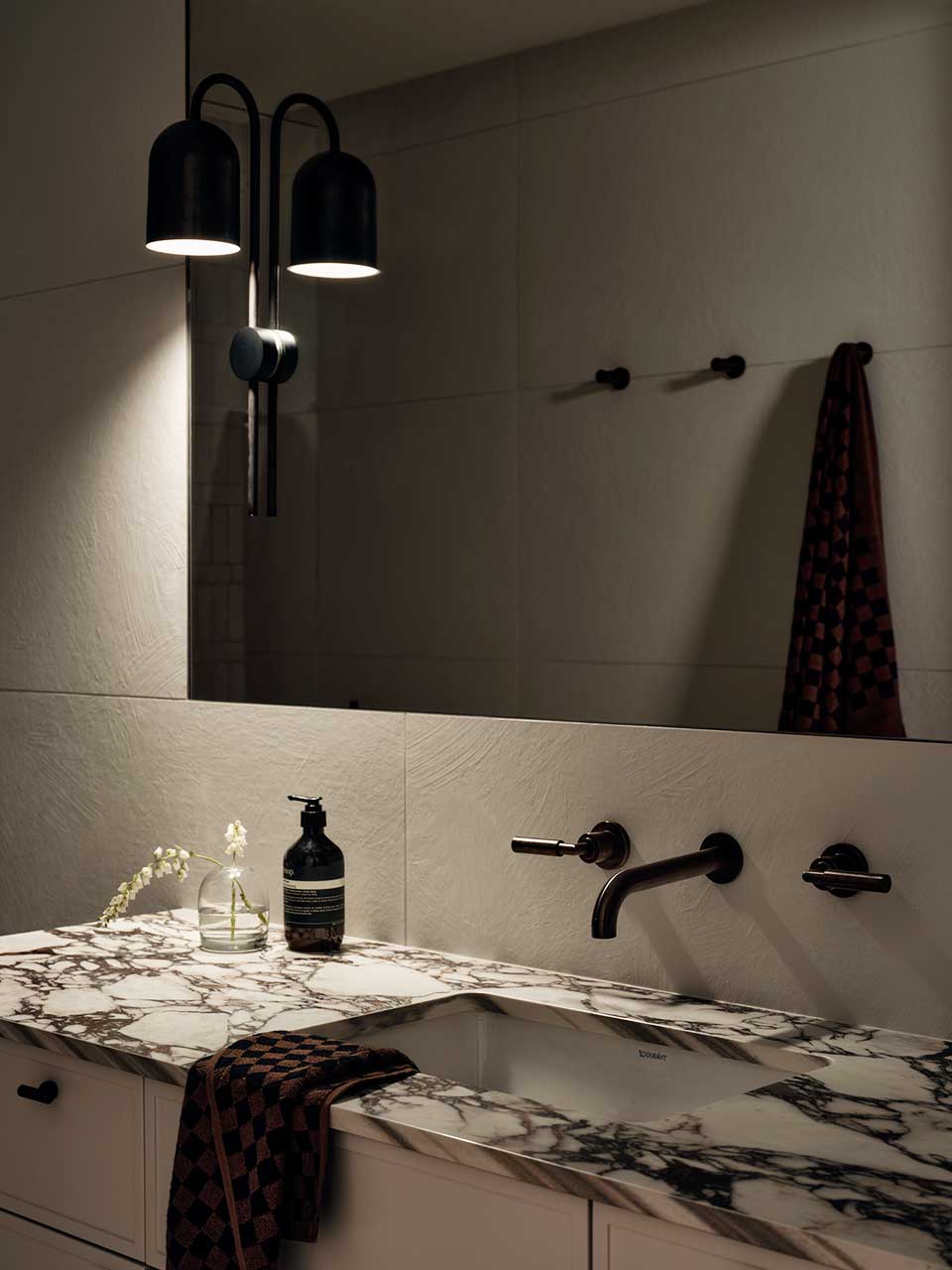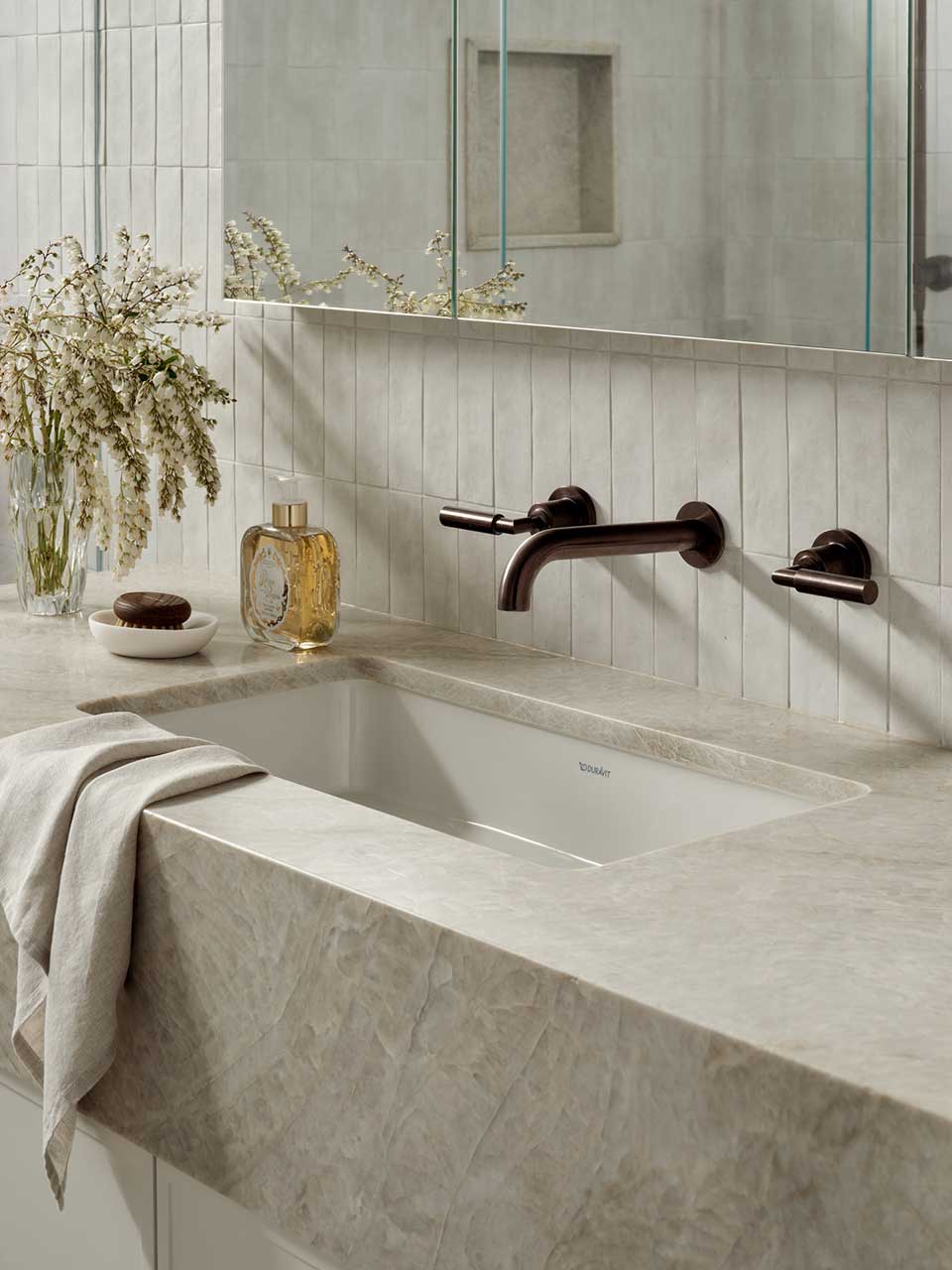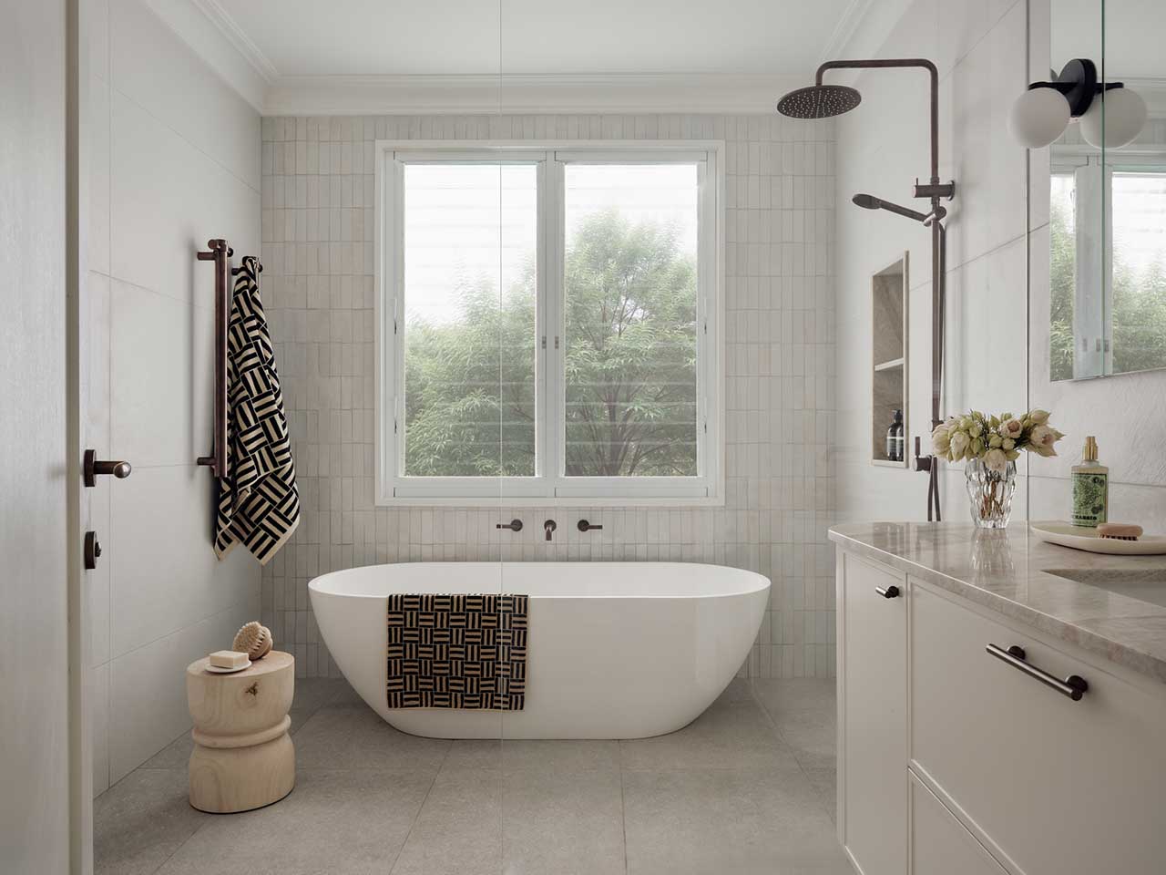 A gorgeous home with warm neutral tones, and textured tiles create a calm, elegant space with loads of charm