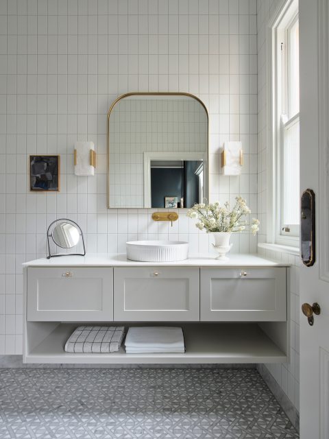Classic pattern marble floor tiles, and brush gold tapware are tasteful choices for the master ensuite in this Victoria home. The large family bathroom features a playful terrazzo inspired porcelain tile, echoing the original terrazzo found at the front of the home.